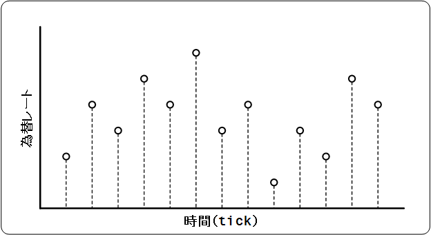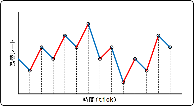 このようにtickではなく時間足で表現することにより、より長い期間のレートの推移や傾向を知ることができます。一定期間内は同じ時間位置で縦方向(為替レート)にだけtick単位で変動し、一定時間が過ぎるとその時間位置は確定し、次の時間位置に移動します。