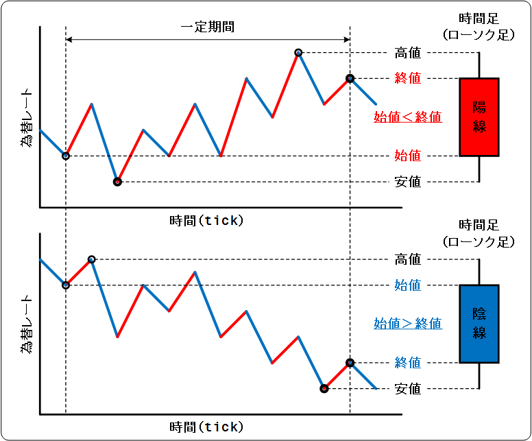 陽線(ようせん)始値 < 終値時間足内のレートが「上昇傾向」にあることを示す