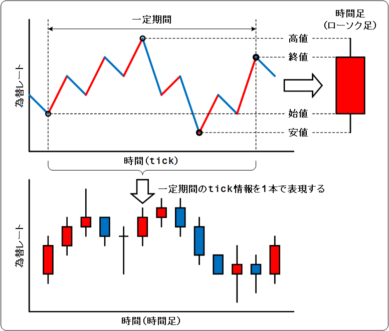 このため、チャートには数種類の時間軸(時間足)があります。任意の時間(一定期間)ごとにtickデータをひとまとめにし、4本値(始値・終値・高値・安値)だけを残してチャートに表示します。
